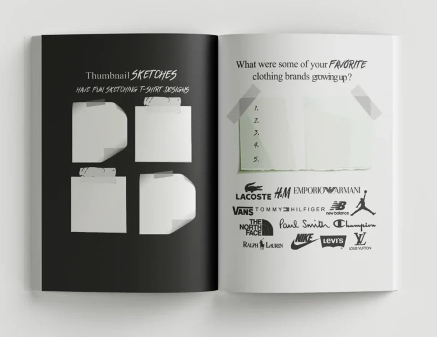 brainstorming, this Workbook is your personal playground for exploration and innovation. Whether you’re researching, defining your target audience, analyzing competitors, sketching out rough concepts, refining intricate details, or experimenting with different styles, the sketchbook encourages you to unleash your imagination and creativity. Let your ideas flow freely as you fill these pages with your unique vision for your t-shirt business.
